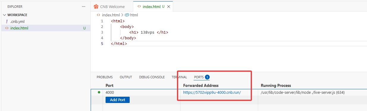 3. 加载完成后,你将看到一个 VS Code 的网页版编辑器。在浏览器底部看到一个 “Port” 的链接,点击它,就能直接访问你刚刚运行的 Web 页面了!